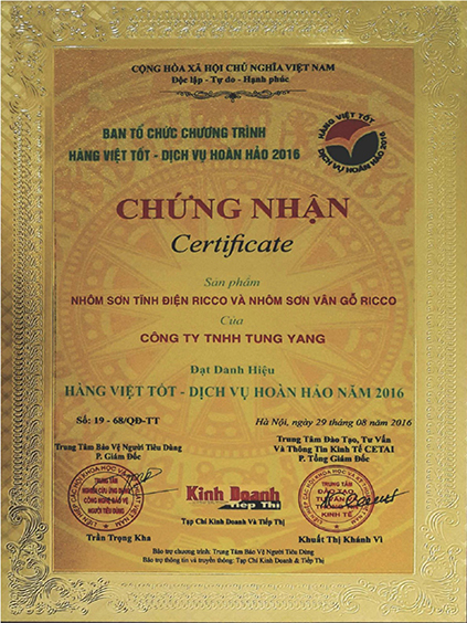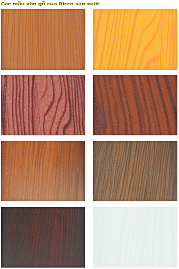 Sản phẩm nhôm vân gỗ của nhà máy có sự đa dạng về mầu sắc và là sản phẩm nhôm vân gỗ duy nhất chịu được khí hậu khắc nghiệt ngoài trời, các vân trên nhôm không bị bay màu, mờ vân, cong vênh. Đó là đặc tính không phải nhôm vân gỗ nào cũng chịu được. Sản phẩm nhôm sơn tĩnh điện Ricco đã đạt danh hiệu Hàng Việt Tốt – Dịch Vụ Hoàn Hảo năm 2016 do người tiêu dùng bình chọn.